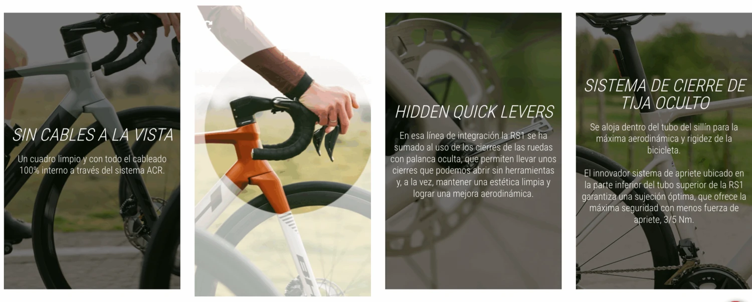 Por un lado la implantación del cableado 100% interno. No existen cables a la vista en la BH RS1 gracias al uso del sistema ACR que, además, permite un mantenimiento cómodo y sencillo. Por otro, el uso de un sistema de cierre de sillín tipo cuña completamente integrado en el tubo superior del cuadro.
