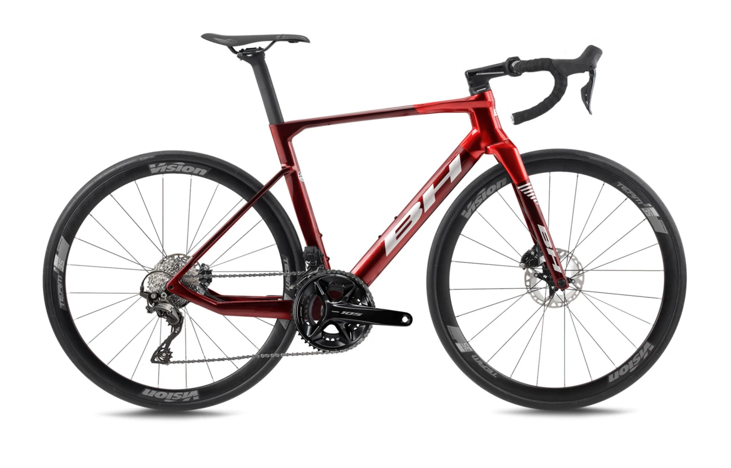 Nueva BH RS1 3.5 con un nuevo cuadro evolucionado, diseño aero pero con una geometría de gran fondo, además se ha diseñado con un cableado interno al 100%, para un cuadro limpio y sin cables, equipada con el nuevo grupo electrónico Shimano 105 de 12v. y unas ruedas Vision Team 35.
