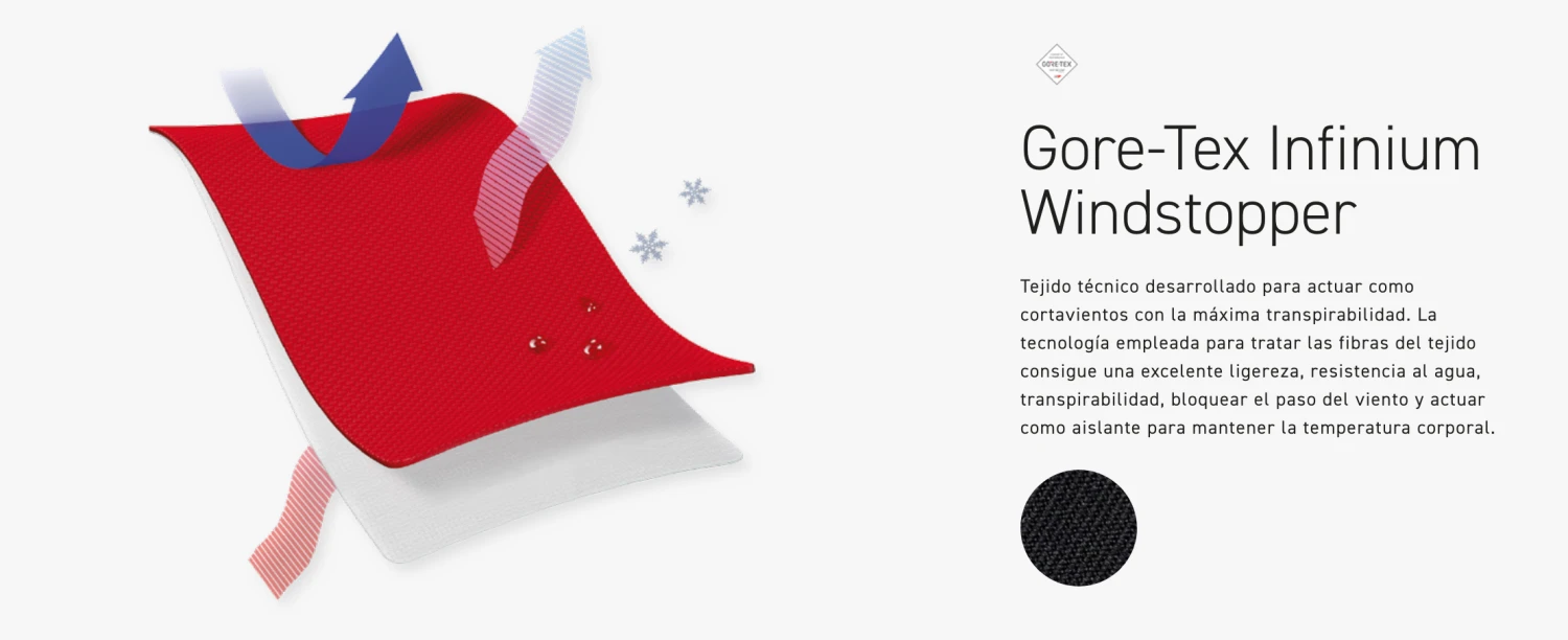 Tejido técnico desarrollado para actuar como cortavientos con la máxima transpirabilidad. La tecnología empleada para tratar las fibras del tejido consigue una excelente ligereza, resistencia al agua, transpirabilidad, bloquear el paso del viento y actuar como aislante para mantener la temperatura corporal.