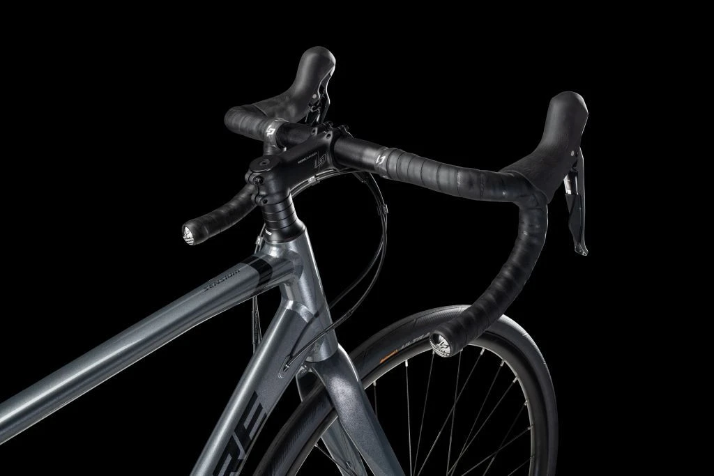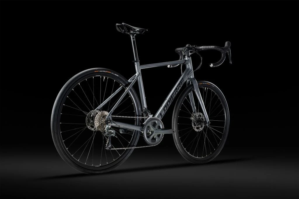 Está equipada con un cuadro de aluminio y horquilla de carbono, con el grupo Shimano Tiagra, neumáticos Continental y sillín Selle Italia.